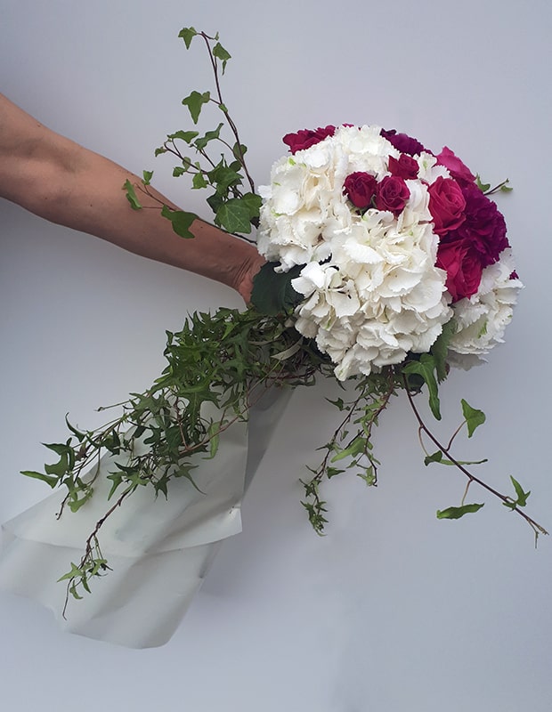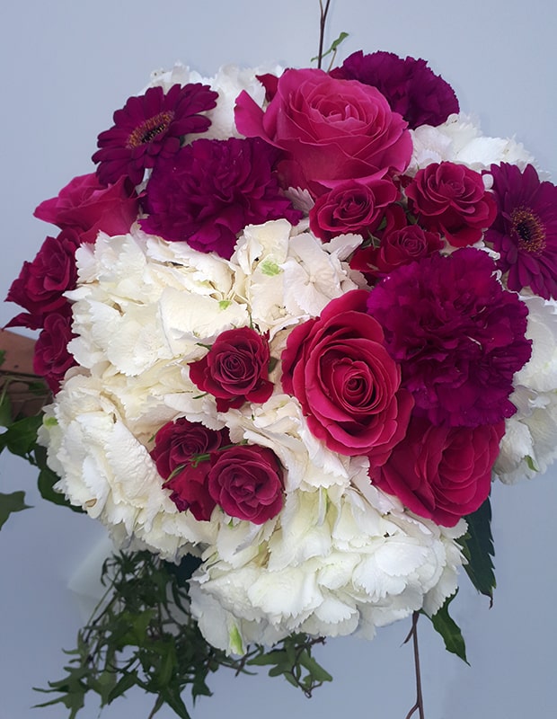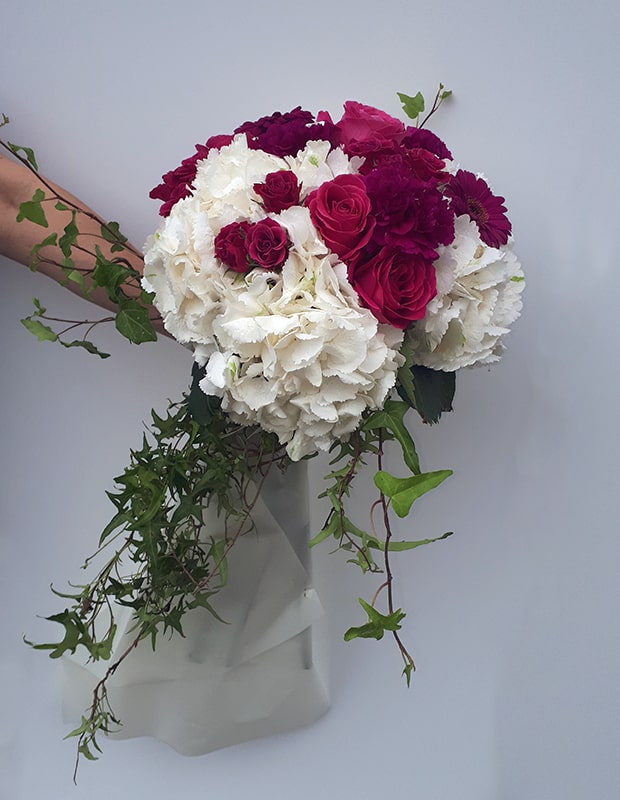 Buket se sastoji od hortensia, pinky ruža, mini ruža, mini gerbera, karanfila, dekorativnog zelenila (hedera) i dekorativnog papira.