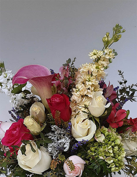 Aranžirana dekorativna kutija se sastoji od cvijeća u pastelnim bojama (ruža, kala, matiola, božura) u kombinaciji s dekorativnim zelenilom (eukaliptusom, cineraria maritima).