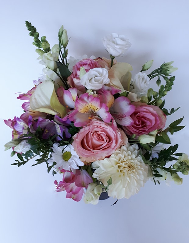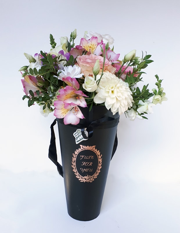 Aranžirana dekorativna kutija u obliku tuljka sastoji se od mix-a sezonskog cvijeća u kombinaciji s dekorativnim zelenilom.
