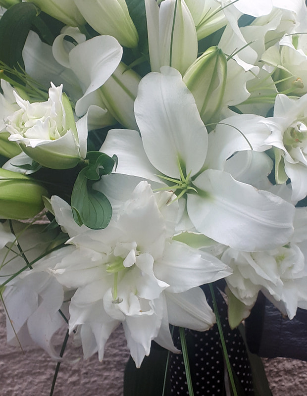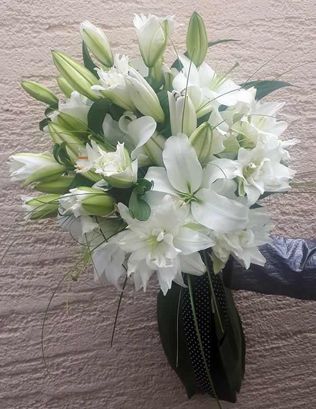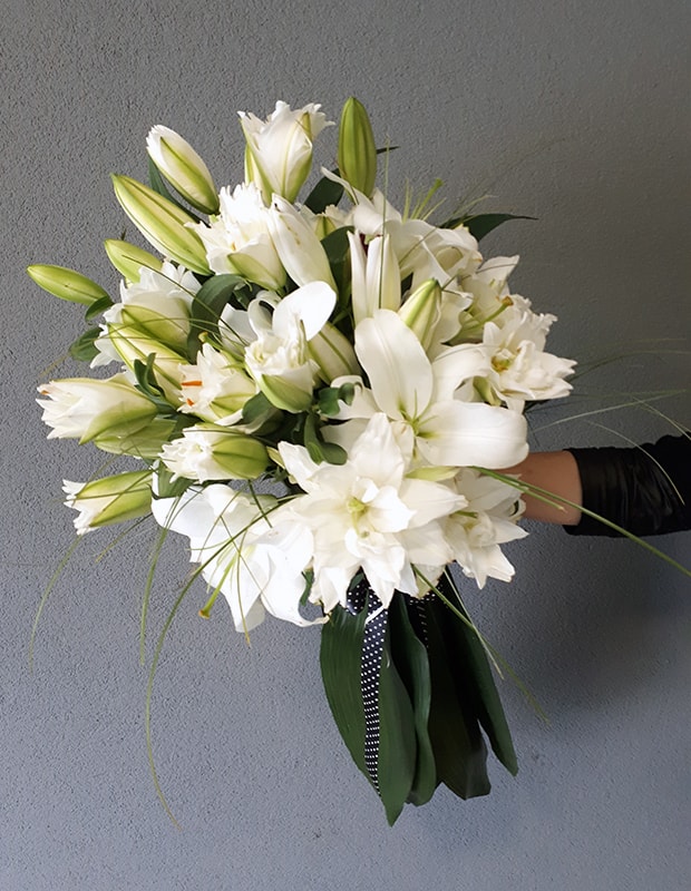 Buket se sastoji od bijelih orijentalnih ljiljana, dekorativnog zelenila (beargrass, aspidisatra) i satenske mašne.