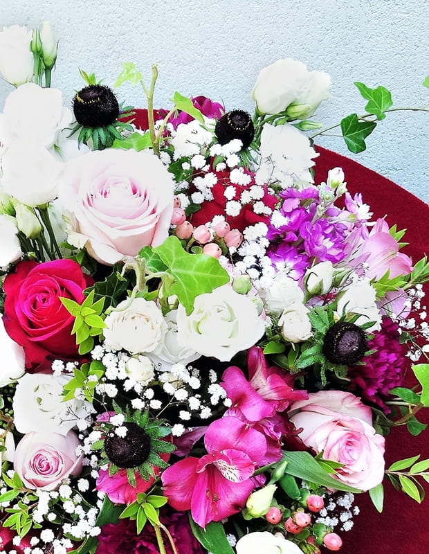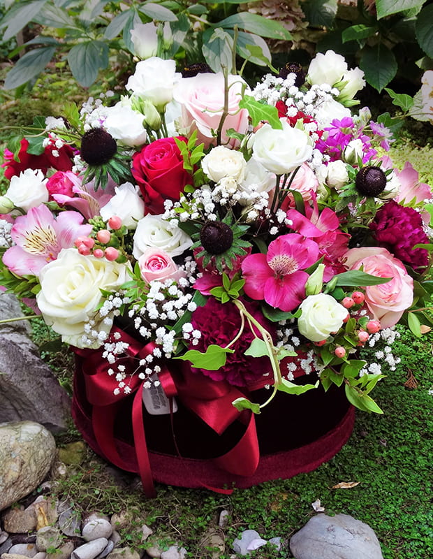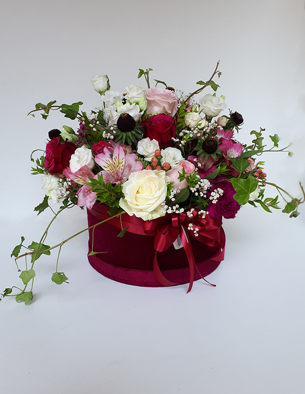 Aranžirana dekorativna kutija se sastoji od cvijeća u pinky bojama (ruža u mix bojama, kala, alstromeria, lisianthus, gypsophila, wax) u kombinaciji s dekorativnim zelenilom (hedera).