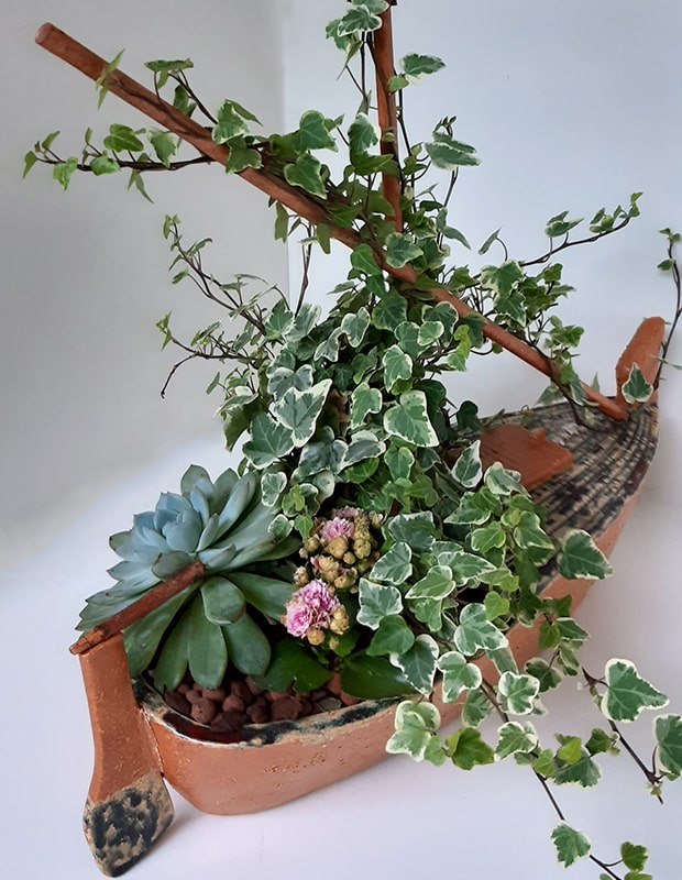 Dekorativni vrtić u ručno rađenoj kreamičkoj posudi (oblik školjke) s mini orhidejom Phalaenopsis i ručno rađenim keramičkim figurama.