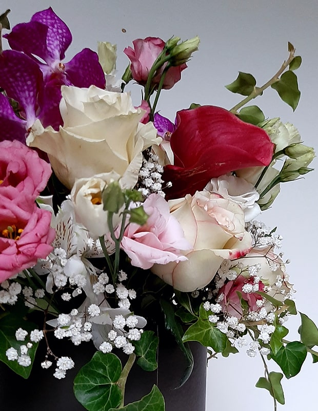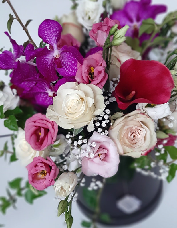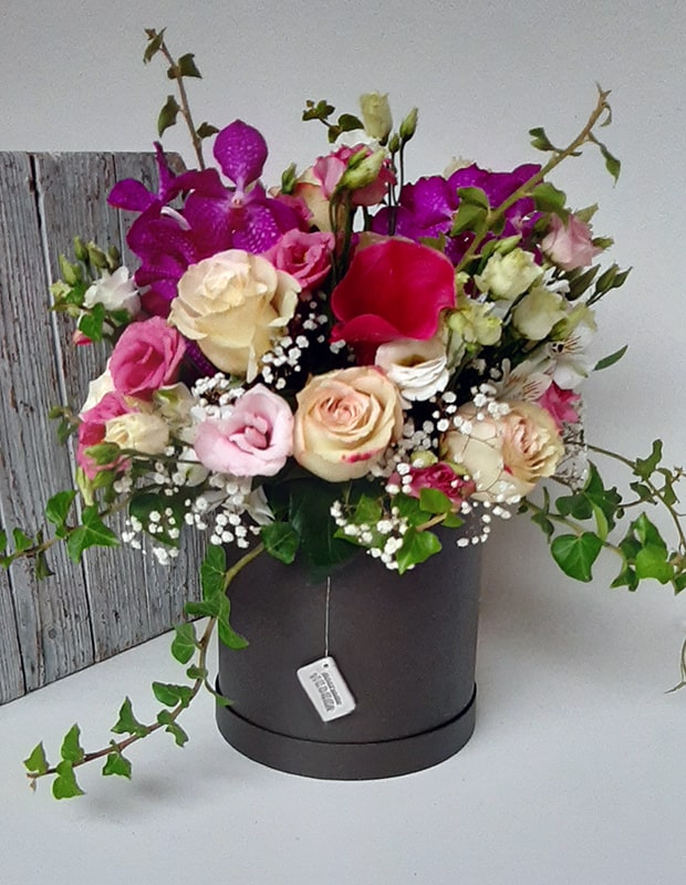 Aranžirana dekorativna kutija se sastoji od cvijeća u pinky bojama (ruža, Vannda orhideja, kala, alstromeria, lisianthus, gypsophila) u kombinaciji s dekorativnim zelenilom (hedera, cineraria maritima).